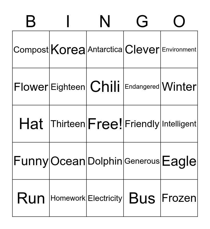 This bingo card has a free space and 81 words: Africa, Air, Antarctica, Atmosphere, Australia, Bear, Begin, Bikini, Bus, Care, Cat, Chicken, Chili, Clever, Coat, Compost, Curious, Dolphin, Dream, Eagle, Egg, Eighteen, Electricity, Endangered, Environment, Extinct, Factory, Fall, Fire, Five, Flower, Flying, Fox, Friendly, Frozen, Funny, Garden, Gatineau, Generous, Grass, Hat, Homework, Human, Hunting, Intelligent, Japan, Korea, Lion, Lunch, Metal, Millionaire, Ocean, Pants, Parent, Plastic, Pollution, Protect, Pumpkin, Recycle, Robot, Run, School, Seven, Share, Sixty-six, Skirt, Smoke, Spring, Summer, Superficial, Sweater, Thirteen, Transportation, Trying, Twin, Two, Vegetable, Watermelon, Wave, Winter and Yesterday.