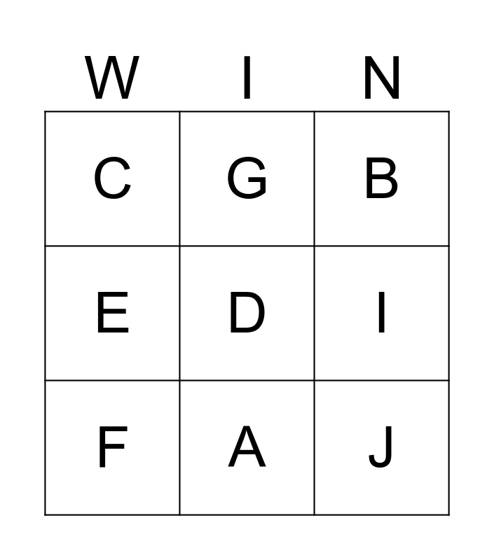 This bingo card has 10 words: A, B, C, D, E, F, G, H, I and J.