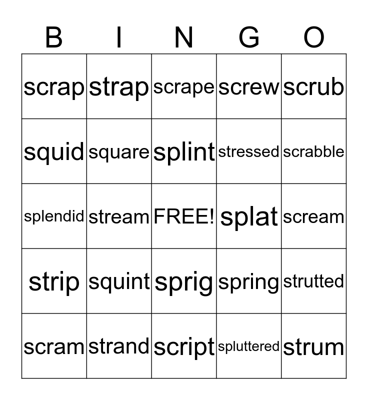 This bingo card has a free space and 24 words: squint, strand, splint, scram, scrub, scrap, squid, strap, splat, sprig, stressed, splendid, spring, strutted, square, spluttered, scream, scrape, scrabble, stream, strum, strip, screw and script.