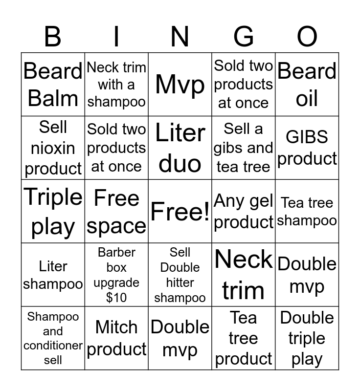 This bingo card has a free space and 34 words: Double MVP, Tea tree product, American Crew product, Beard detail, Liter shampoo, Sold two products at once, Beard oil, Shampoo and conditioner sell, Neck trim with a shampoo, Deatailed haircut add on, Liter duo, Mvp, Triple MVP, Nioxin kit, Any gel product, GIBS product, Mitch product, Triple play, Barber box upgrade $10, Neck trim, Sell Double hitter shampoo, Neck trim with a mvp upgrade, Beard Balm, Tea tree shampoo, Double mvp, Double triple play, Sold two products at once, Sell Two Mitch products, Sell a gibs and tea tree, Sell nioxin product, Sell one puck, Free space, Double mvp and Neck trim.