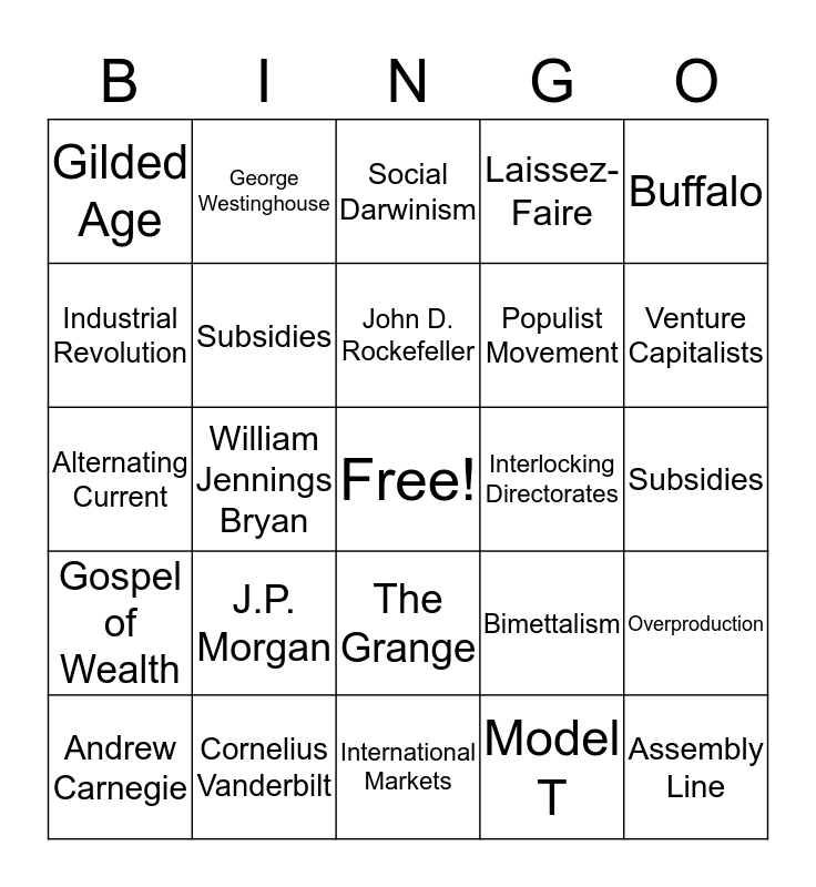 This bingo card has a free space and 24 words: J.P. Morgan, Cornelius Vanderbilt, John D. Rockefeller, Andrew Carnegie, Buffalo, Gilded Age, Industrial Revolution, George Westinghouse, Interlocking Directorates, The Grange, Populist Movement, Alternating Current, Bimettalism, Overproduction, Subsidies, Model T, Subsidies, Social Darwinism, Venture Capitalists, William Jennings Bryan, Assembly Line, Gospel of Wealth, Laissez-Faire and International Markets.