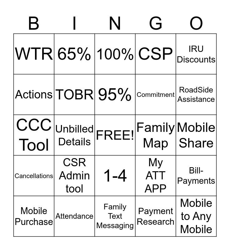This bingo card has a free space and 34 words: Payment Arrangement, Payment Research, Credits and Adjustments, Upgrade Fee, Cancellations, TOBR, IRU Discounts, Mobile Purchase, 65%, 90%, 95%, 100%, Family Talk 700, Blocked Payments, Family Map, RoadSide Assistance, Attendance, CCC Tool, CSR Admin tool, My ATT APP, 1-4, 5, WTR, Mobile Share, Family Text Messaging, Mobile to Any Mobile, CSP, NBA, Commitment, Actions, Unbilled Summary, Unbilled Details, Bill-Payments and Cell Phone.