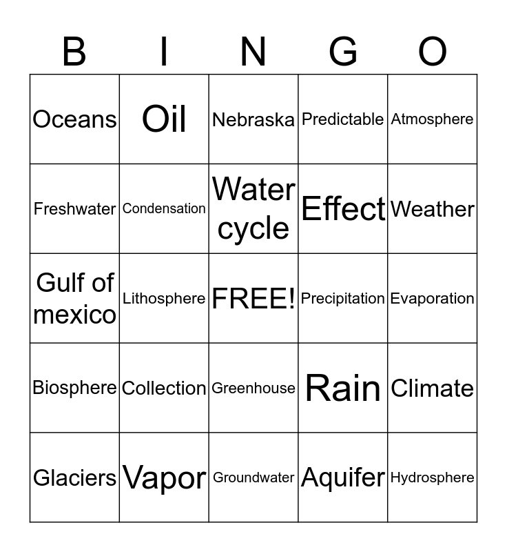 This bingo card has a free space and 24 words: Collection, Vapor, Water cycle, Glaciers, Atmosphere, Oceans, Freshwater, Oil, Precipitation, Greenhouse, Effect, Gulf of mexico, Rain, Climate, Condensation, Aquifer, Evaporation, Nebraska, Weather, Lithosphere, Hydrosphere, Biosphere, Predictable and Groundwater.