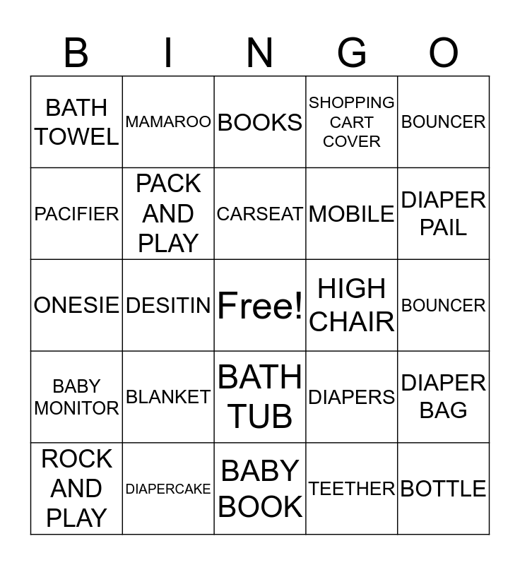 This bingo card has a free space and 24 words: BLANKET, DIAPERCAKE, CARSEAT, ROCK AND PLAY, BOUNCER, BATH TOWEL, PACIFIER, MAMAROO, HIGH CHAIR, BATH TUB, MOBILE, ONESIE, DIAPERS, DIAPER BAG, PACK AND PLAY, TEETHER, BOUNCER, BOOKS, DIAPER PAIL, DESITIN, BOTTLE, BABY MONITOR, SHOPPING CART COVER and BABY BOOK.