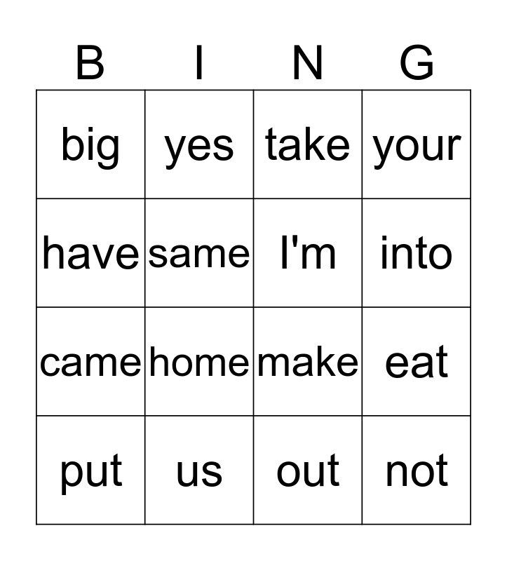 This bingo card has 16 words: us, eat, take, big, came, yes, make, out, have, same, put, your, home, into, I'm and not.