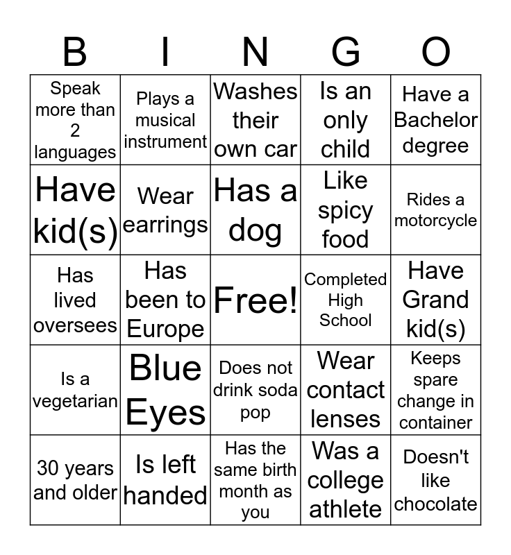This bingo card has a free space and 24 words: Blue Eyes, Is left handed, Has a dog, 30 years and older, Have a Bachelor degree, Speak more than 2 languages, Have kid(s), Plays a musical instrument, Completed High School, Does not drink soda pop, Like spicy food, Has lived oversees, Wear contact lenses, Keeps spare change in container, Wear earrings, Was a college athlete, Have Grand kid(s), Washes their own car, Rides a motorcycle, Has been to Europe, Doesn't like chocolate, Is a vegetarian, Is an only child and Has the same birth month as you.