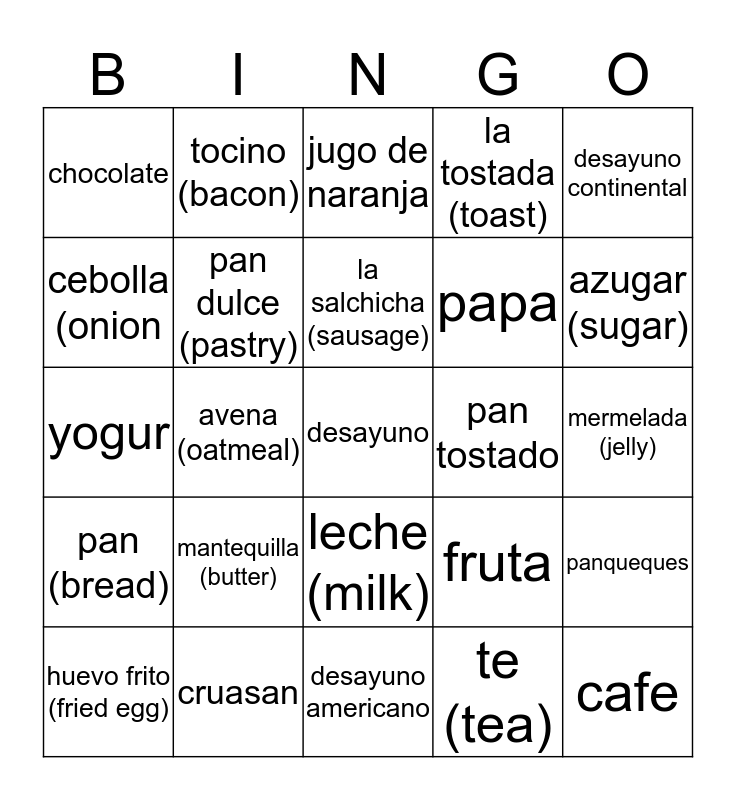 This bingo card has a free space and 29 words: huevo frito (fried egg), huevo revuelto (scrambled egg), avena (oatmeal), chorizo (spicy sausage), chocolate, jugo de naranja, pan dulce (pastry), mantequilla (butter), pan tostado, cruasan, mermelada (jelly), cafe, desayuno americano, te (tea), azugar (sugar), miel (honey), leche (milk), pan (bread), desayuno continental, yogur, fruta, omelet, papa, cebolla (onion, la tostada (toast), tocino (bacon), panqueques, la salchicha (sausage) and cereal.