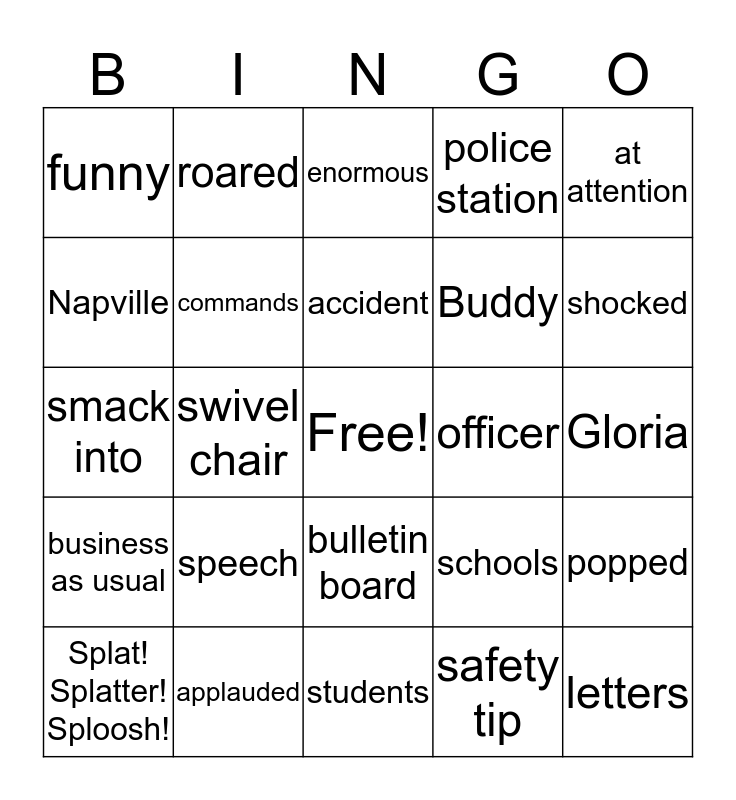 This bingo card has a free space and 32 words: safety tip, thumb-tacked, swivel chair, snoring, business as usual, commands, at attention, popped, roared, with plenty of expression, accident, enormous, auditorium, Bravo!, officer, banana pudding, Splat! Splatter! Sploosh!, smack into, bulletin board, speech, schools, listened, Gloria, applauded, letters, police station, Buddy, Napville, funny, students, principal and shocked.