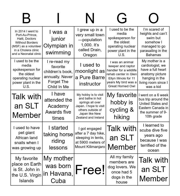 This bingo card has 25 words: I used to have pet giant African land snails when I was growing up, My mother was born in Havana, Cuba, My hobby is to visit and bathe in hot springs all over Japan. I hope to visit others outside of Japan like New Zealand and Ireland, All my family members are dog lovers. We once had 5 dogs in the house, I’m scared of heights and can’t swim but somehow I managed to go parasailing in the Bahamas, In 2014 I went to Port-Au-Prince, Haiti, Doctors Without Borders (MSF) as a volunteer in a Cholera clinic and a Neonatal clinic, I was a junior Olympian in swimming, I grew up in a very small town—population 1,000. It’s called Drain, Oregon, My favorite hobby is cycling & hiking, I learned to scuba dive five years ago because I was terrified of the ocean, I used to be the media spokesperson for the oldest operating nuclear power plant in the U.S., I re-read my favorite children’s book, annually. Never Forget The Child In Me, Free!, Talk with an SLT Member, My mother is a cardiologist, we have a full heart anatomy picture hanging in the living room since I was a kid, My favorite place on Earth is St. John in the U.S. Virgin Islands, I have attended the Academy Awards five times, I used to moonlight as a Pure Barre instructor, I was an animal keeper and raptor handler for a wildlife rehab center in Glen Ellyn Illinois for 11 years My bird was a Great Horned Owl, I went on a 6 week bus trip around the United States and Eastern Canada in the summer of 9-10th grade, Talk with an SLT Member, I started taking horse riding lessons, I got engaged after a 7 day hike, sleeping in tents, at 5900 meters of Mount Kilimanjaro, I used to be the media spokesperson for the oldest operating nuclear power plant in the U.S. and Talk with an SLT Member.