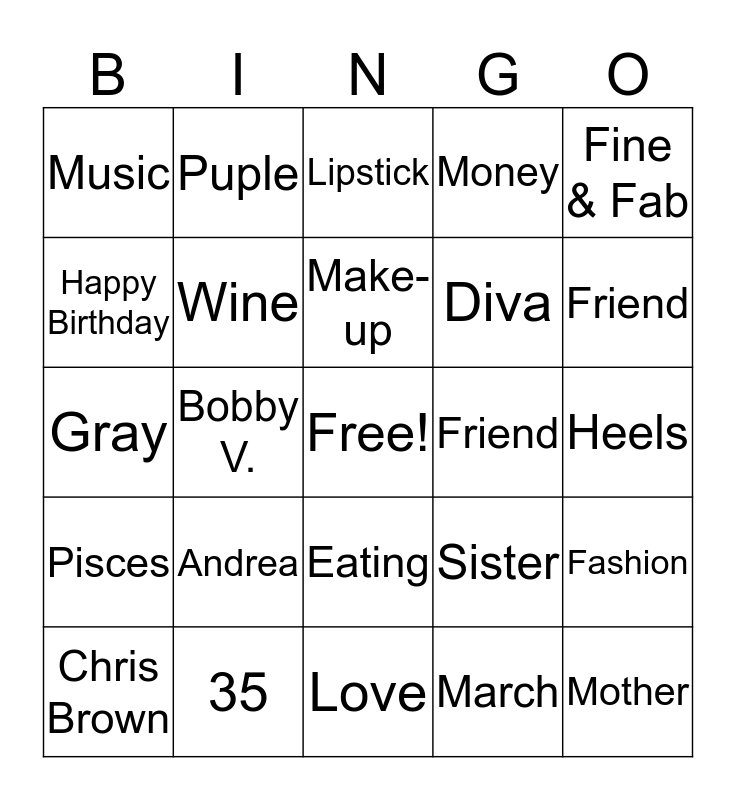 This bingo card has a free space and 24 words: Andrea, 35, Make-up, Chris Brown, Fine & Fab, Music, Happy Birthday, Puple, Friend, Eating, Diva, Gray, Sister, Fashion, Wine, March, Heels, Lipstick, Friend, Bobby V., Mother, Pisces, Money and Love.