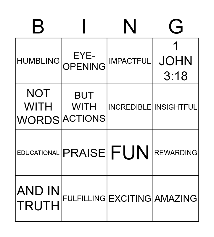 This bingo card has 16 words: FULFILLING, REWARDING, IMPACTFUL, HUMBLING, EDUCATIONAL, EYE-OPENING, FUN, EXCITING, NOT WITH WORDS, BUT WITH ACTIONS, AND IN TRUTH, 1 JOHN 3:18, PRAISE, INSIGHTFUL, INCREDIBLE and AMAZING.