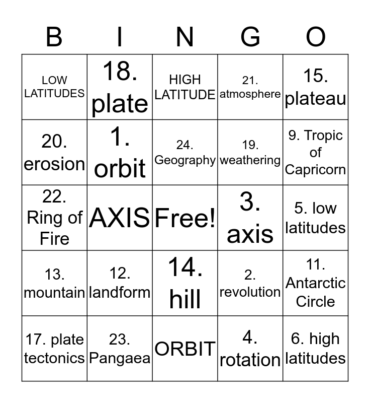 This bingo card has a free space and 31 words: ORBIT, REVOLUTION, AXIS, ROTATION, LOW LATITUDES, HIGH LATITUDE, 1. orbit, 2. revolution, 3. axis, 4. rotation, 5. low latitudes, 6. high latitudes, 7. middle latitudes, 8. Tropic of Cancer, 9. Tropic of Capricorn, 10. Arctic Circle, 11. Antarctic Circle, 12. landform, 13. mountain, 14. hill, 15. plateau, 16. plain, 17. plate tectonics, 18. plate, 19. weathering, 20. erosion, 21. atmosphere, 22. Ring of Fire, 23. Pangaea, 24. Geography and 25. distortion.