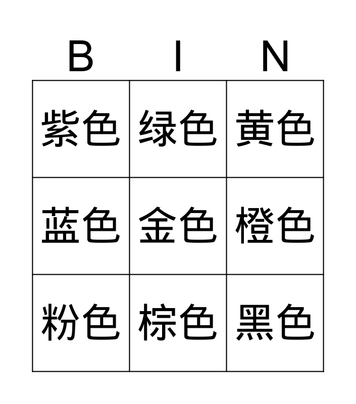 This bingo card has a free space and 9 words: 粉色, 黄色, 绿色, 蓝色, 紫色, 橙色, 黑色, 白色 and 棕色.