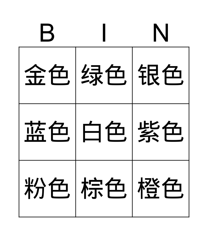 This bingo card has a free space and 9 words: 粉色, 银色, 绿色, 蓝色, 金色, 紫色, 橙色, 黑色 and 棕色.