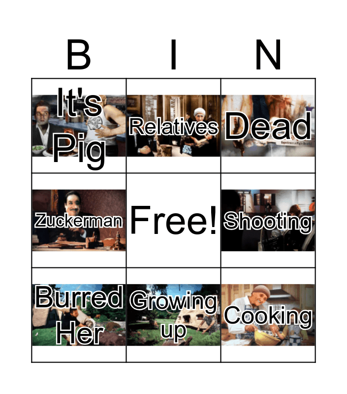 This bingo card has 11 images, a free space and 11 words: New Born, Growing up, Cooking, Burred Her, Relatives, Dead, Shooting, NYC, Zuckerman, It's Pig and Visit.