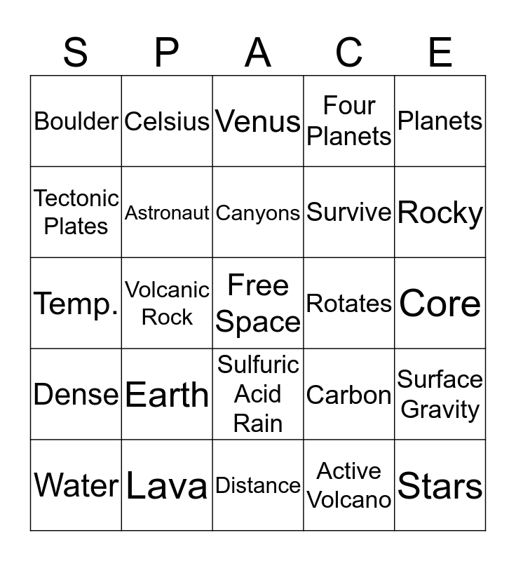 This bingo card has a free space and 24 words: Earth, Lava, Canyons, Water, Planets, Boulder, Tectonic Plates, Celsius, Rotates, Sulfuric Acid Rain, Survive, Temp., Carbon, Surface Gravity, Astronaut, Active Volcano, Core, Venus, Rocky, Volcanic Rock, Stars, Dense, Four Planets and Distance.