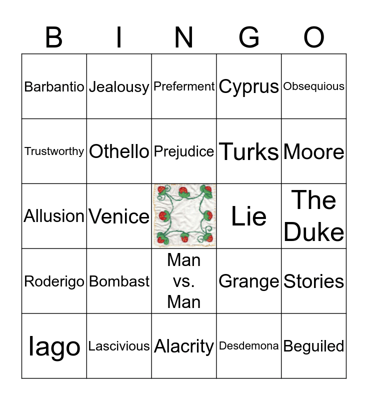 This bingo card has a free space and 29 words: Iago, Deluding, Venice, Promulgate, Barbantio, Preferment, Othello, Bombast, Lie, Lascivious, The Duke, Beguiled, Alacrity, Desdemona, Moore, Revenge, Man vs. Man, Roderigo, Obsequious, Allusion, Grange, Cassio, Turks, Trustworthy, Cyprus, Jealousy, Stories, Prejudice and Money.