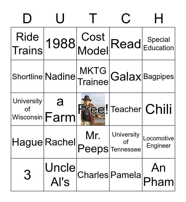 This bingo card has a free space and 26 words: Mr. Peeps, Pamela, MKTG Trainee, Uncle Al's, Special Education, Ride Trains, Shortline, 1988, Chili, University of Tennessee, Galax, University of Wisconsin, Locomotive Engineer, 3, a Farm, Europe, Read, Hague, Cost Model, An Pham, Bagpipes, Charles, Teacher, Rachel, Nadine and Kyle.