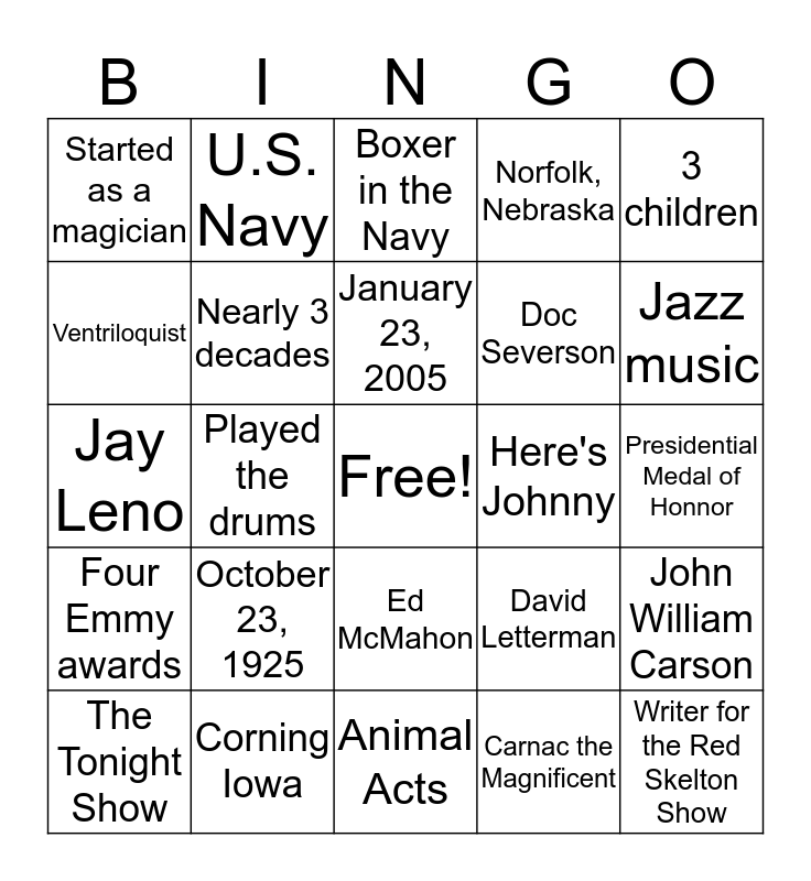 This bingo card has a free space and 24 words: October 23, 1925, Corning Iowa, January 23, 2005, The Tonight Show, 3 children, Started as a magician, Ventriloquist, U.S. Navy, Here's Johnny, Ed McMahon, Doc Severson, Jay Leno, David Letterman, John William Carson, Nearly 3 decades, Carnac the Magnificent, Presidential Medal of Honnor, Boxer in the Navy, Jazz music, Played the drums, Writer for the Red Skelton Show, Four Emmy awards, Norfolk, Nebraska and Animal Acts.