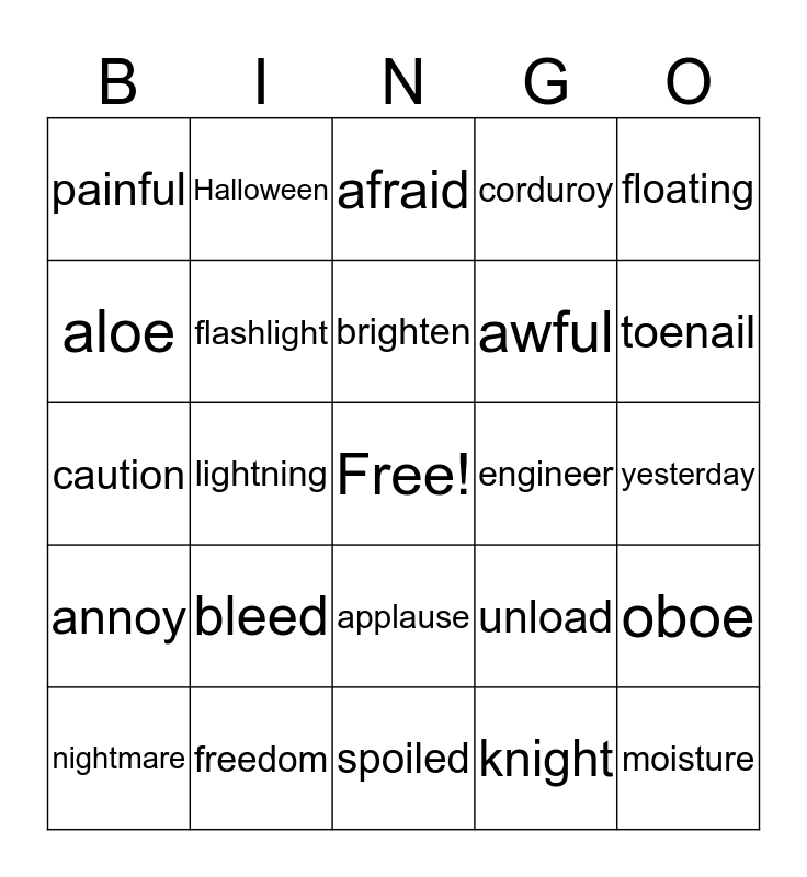 This bingo card has a free space and 24 words: bleed, freedom, brighten, nightmare, floating, painful, aloe, Halloween, engineer, applause, awful, caution, unload, oboe, flashlight, knight, yesterday, afraid, toenail, lightning, moisture, annoy, corduroy and spoiled.