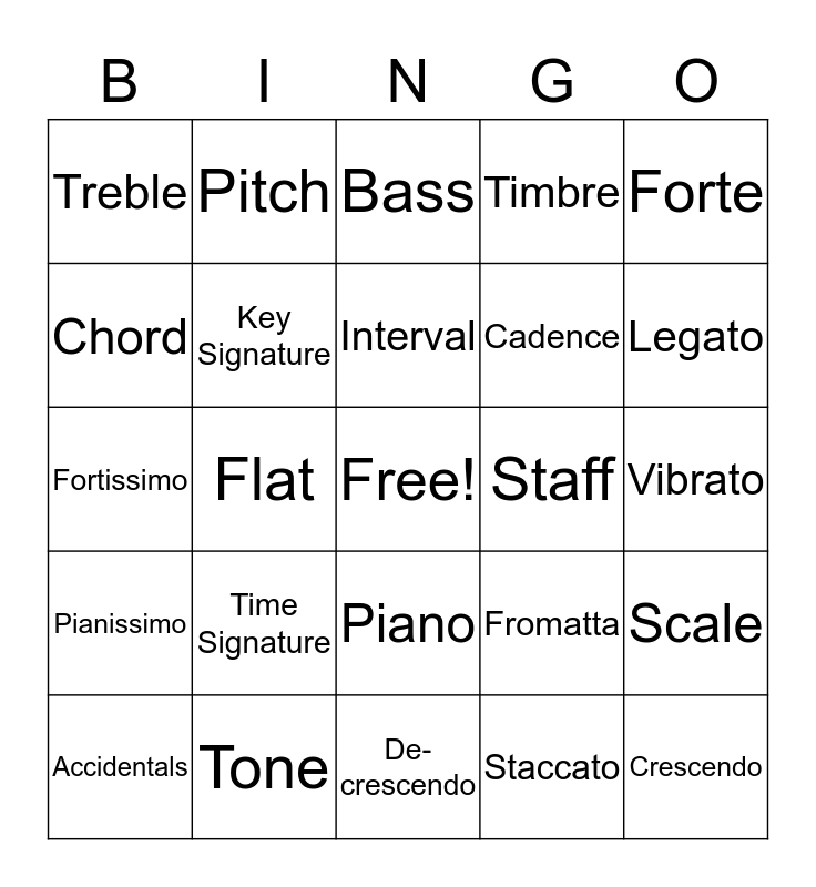 This bingo card has a free space and 29 words: Accidentals, Sharp, Flat, Natural, Treble, Bass, Key Signature, Time Signature, Staff, Tone, Vibrato, Crescendo, De- crescendo, Staccato, Legato, Tenuto, Piano, Pianissimo, Forte, Fortissimo, Fromatta, Coda, Cadence, Chord, Timbre, Pitch, Scale, Interval and Chromatic.