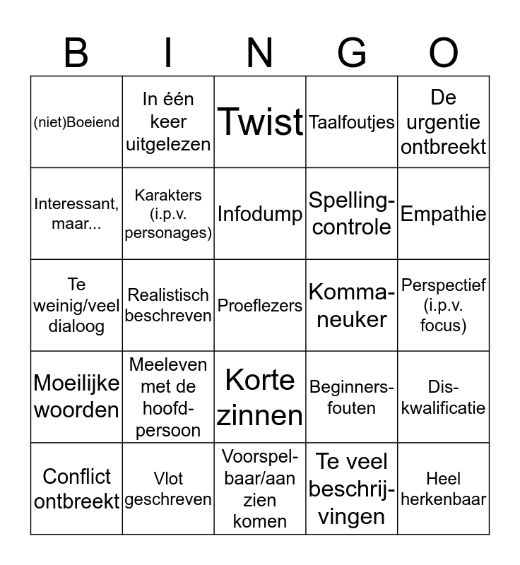 This bingo card has 25 words: Meeleven met de hoofd-persoon, Voorspel-baar/aan zien komen, Infodump, Conflict ontbreekt, De urgentie ontbreekt, (niet)Boeiend, Interessant, maar..., In één keer uitgelezen, Komma-neuker, Korte zinnen, Spelling-controle, Te weinig/veel dialoog, Beginners-fouten, Dis-kwalificatie, Karakters (i.p.v. personages), Heel herkenbaar, Perspectief (i.p.v. focus), Twist, Empathie, Realistisch beschreven, Proeflezers, Vlot geschreven, Moeilijke woorden, Taalfoutjes and Te veel beschrij-vingen.