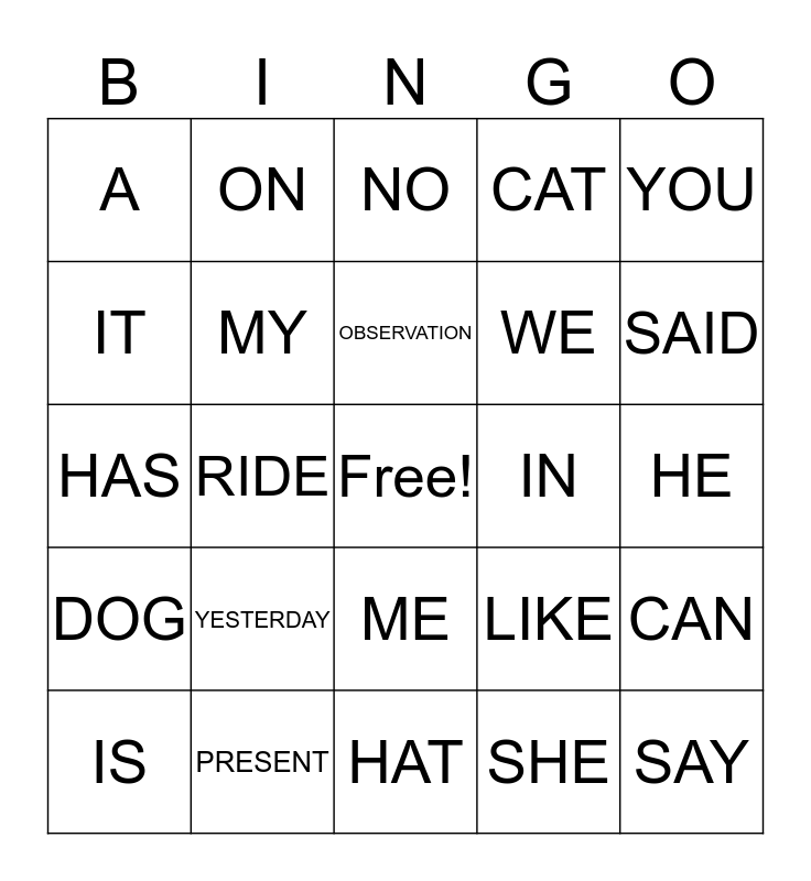 This bingo card has a free space and 24 words: YESTERDAY, PRESENT, OBSERVATION, IS, YOU, A, IT, ON, IN, ME, WE, HAS, LIKE, CAN, MY, SHE, HE, NO, SAID, RIDE, SAY, DOG, CAT and HAT.