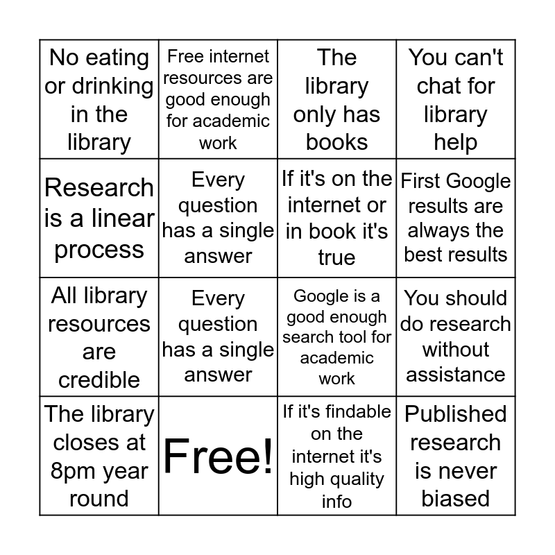 This bingo card has 16 words: Free!, You should do research without assistance, The library only has books, No eating or drinking in the library, All library resources are credible, Free internet resources are good enough for academic work, Google is a good enough search tool for academic work, If it's findable on the internet it's high quality info, Research is a linear process, Every question has a single answer, The library closes at 8pm year round, You can't chat for library help, Every question has a single answer, First Google results are always the best results, If it's on the internet or in book it's true and Published research is never biased.
