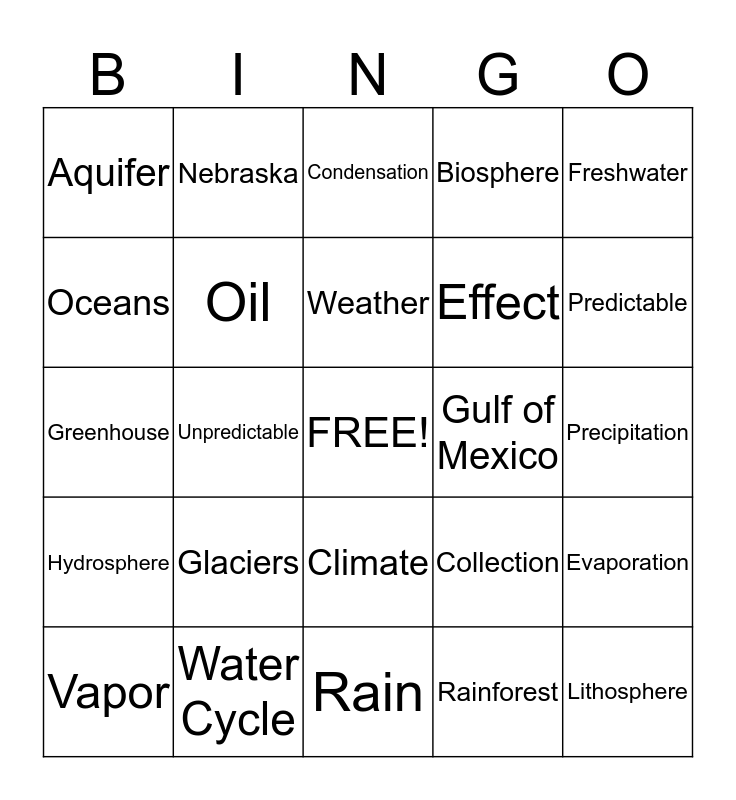 This bingo card has a free space and 24 words: Glaciers, Water Cycle, Weather, Vapor, Freshwater, Aquifer, Oceans, Nebraska, Gulf of Mexico, Climate, Effect, Greenhouse, Collection, Evaporation, Oil, Rainforest, Precipitation, Condensation, Predictable, Unpredictable, Lithosphere, Hydrosphere, Biosphere and Rain.