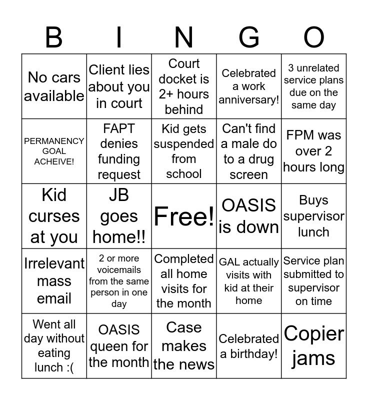 This bingo card has a free space and 24 words: 2 or more voicemails from the same person in one day, OASIS queen for the month, Kid gets suspended from school, Went all day without eating lunch :(, 3 unrelated service plans due on the same day, No cars available, PERMANENCY GOAL ACHEIVE!, Client lies about you in court, OASIS is down, Completed all home visits for the month, Can't find a male do to a drug screen, Kid curses at you, GAL actually visits with kid at their home, Service plan submitted to supervisor on time, FAPT denies funding request, Celebrated a birthday!, Buys supervisor lunch, Court docket is 2+ hours behind, FPM was over 2 hours long, JB goes home!!, Copier jams, Irrelevant mass email, Celebrated a work anniversary! and Case makes the news.