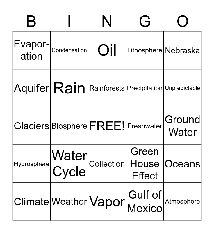 This bingo card has a free space and 24 words: Water Cycle, Weather, Rainforests, Climate, Nebraska, Evapor- ation, Aquifer, Condensation, Freshwater, Collection, Precipitation, Glaciers, Green House Effect, Oceans, Rain, Gulf of Mexico, Ground Water, Oil, Unpredictable, Biosphere, Atmosphere, Hydrosphere, Lithosphere and Vapor.