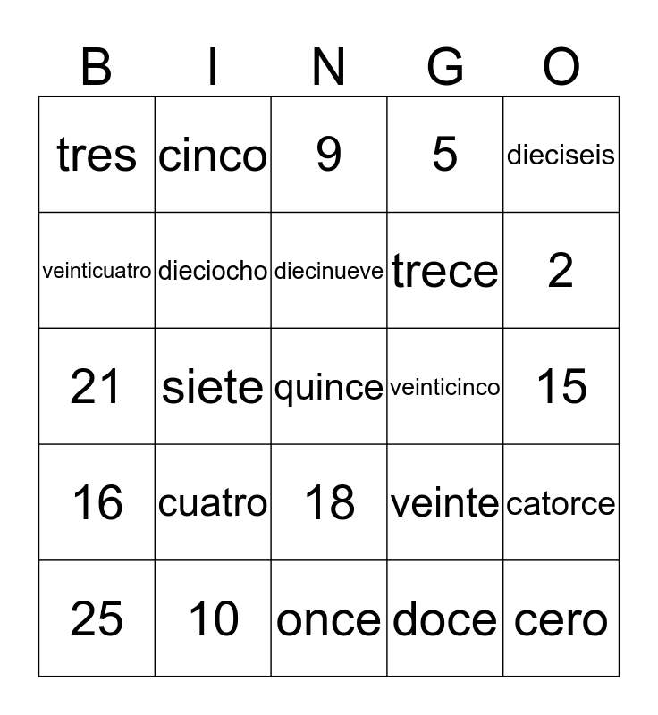 This bingo card has 52 words: uno, quince, nueve, once, cuatro, veintidos, cinco, diecisiete, veinticuatro, veintidos, dieciocho, veintres, catorce, veinte, seis, diez, diecinueve, veinticinco, dos, dieciseis, siete, doce, tres, trece, ocho, cero, 0, 1, 2, 3, 4, 5, 6, 7, 8, 9, 10, 11, 12, 13, 14, 15, 16, 17, 18, 19, 20, 21, 22, 23, 25 and 25.