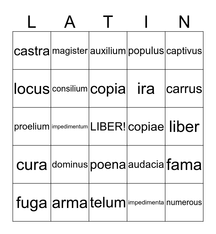 This bingo card has a free space and 29 words: animus, arma, auxilium, auxilia, captivus, castra, consilium, copia, copiae, fama, fuga, impedimentum, impedimenta, numerous, proelium, signum, telum, audacia, carrus, cura, dominus, inopia, ira, liber, locus, magister, poena, populus and socius.