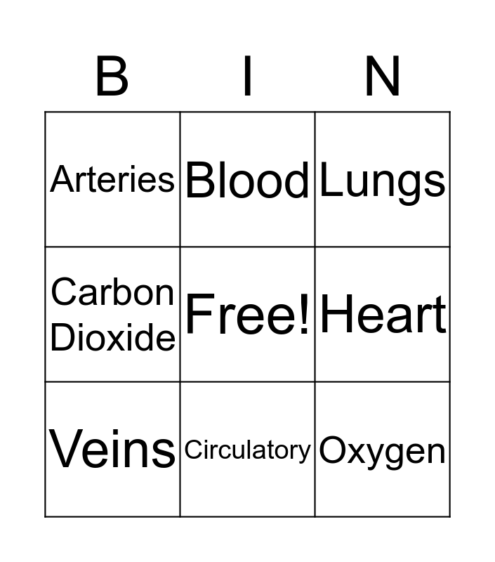 This bingo card has a free space and 8 words: Heart, Lungs, Blood, Veins, Arteries, Oxygen, Carbon Dioxide and Circulatory.