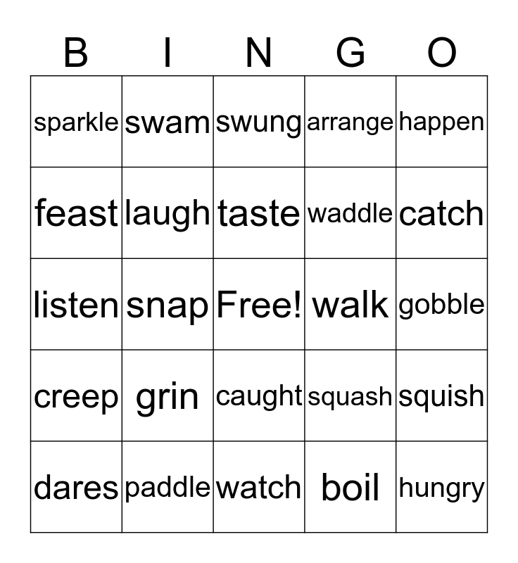 This bingo card has a free space and 24 words: grin, paddle, taste, dares, happen, sparkle, feast, swam, walk, caught, waddle, listen, squash, squish, laugh, boil, gobble, swung, catch, snap, hungry, creep, arrange and watch.
