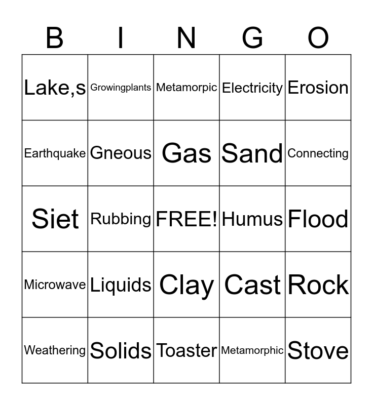 This bingo card has a free space and 24 words: Liquids, Solids, Gas, Weathering, Erosion, Lake,s, Earthquake, Growingplants, Humus, Clay, Sand, Siet, Cast, Rock, Gneous, Metamorphic, Flood, Metamorpic, Connecting, Rubbing, Stove, Microwave, Electricity and Toaster.