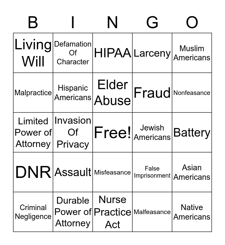 This bingo card has a free space and 24 words: Assault, Durable Power of Attorney, Elder Abuse, Criminal Negligence, Muslim Americans, Living Will, Malpractice, Defamation Of Character, Jewish Americans, Misfeasance, Fraud, Limited Power of Attorney, False Imprisonment, Asian Americans, Hispanic Americans, Malfeasance, Battery, HIPAA, Nonfeasance, Invasion Of Privacy, Native Americans, DNR, Larceny and Nurse Practice Act.