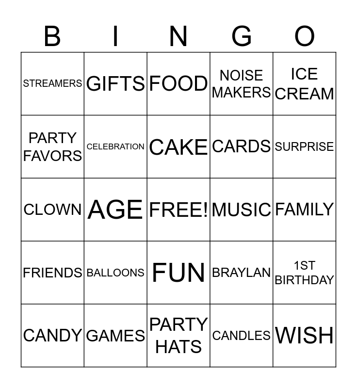 This bingo card has a free space and 24 words: BALLOONS, GAMES, CAKE, CANDY, ICE CREAM, STREAMERS, PARTY FAVORS, GIFTS, MUSIC, FUN, CARDS, CLOWN, BRAYLAN, 1ST BIRTHDAY, CELEBRATION, CANDLES, FAMILY, FOOD, SURPRISE, AGE, WISH, FRIENDS, NOISE MAKERS and PARTY HATS.