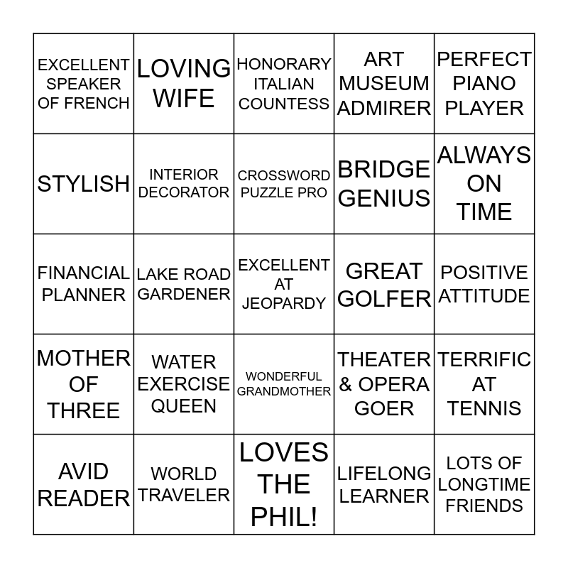 This bingo card has a free space and 24 words: WATER EXERCISE QUEEN, WORLD TRAVELER, CROSSWORD PUZZLE PRO, AVID READER, PERFECT PIANO PLAYER, EXCELLENT SPEAKER OF FRENCH, STYLISH, LOVING WIFE, GREAT GOLFER, WONDERFUL GRANDMOTHER, BRIDGE GENIUS, FINANCIAL PLANNER, THEATER & OPERA GOER, TERRIFIC AT TENNIS, INTERIOR DECORATOR, LIFELONG LEARNER, POSITIVE ATTITUDE, HONORARY ITALIAN COUNTESS, ALWAYS ON TIME, LAKE ROAD GARDENER, LOTS OF LONGTIME FRIENDS, MOTHER OF THREE, ART MUSEUM ADMIRER and LOVES THE PHIL!.