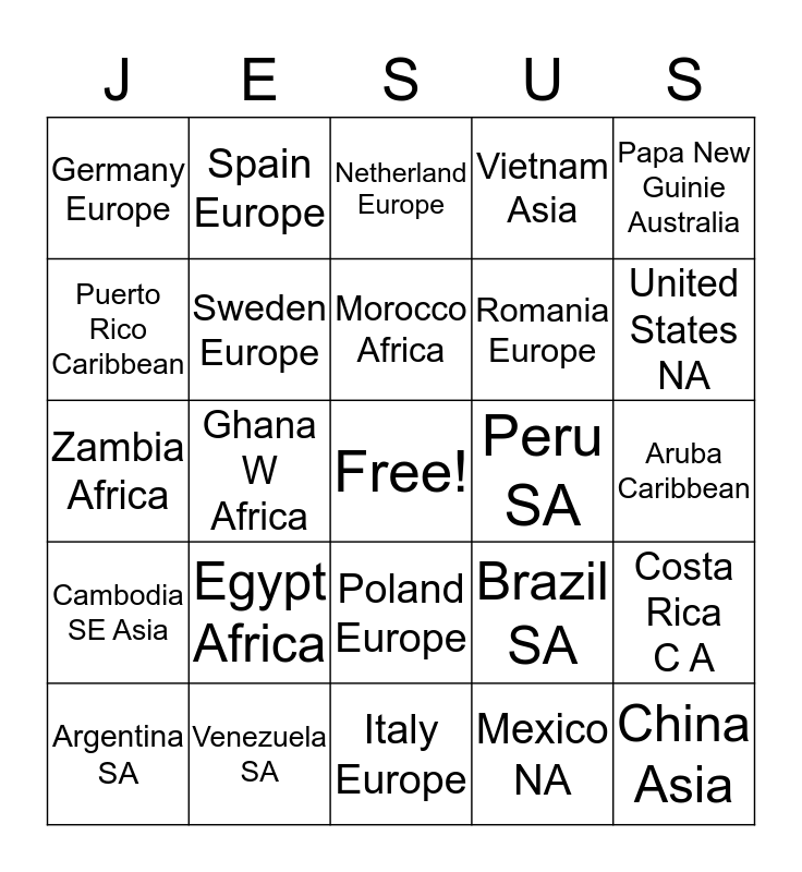 This bingo card has a free space and 44 words: France SA, China Asia, Philippines Asia, Argentina SA, Kenya Africa, Mexico NA, Netherland Europe, North Korea Asia, Papa New Guinie Australia, Venezuela SA, Vietnam Asia, Peru SA, Poland Europe, Egypt Africa, Cuba NA, Italy Europe, Switzerland Europe, Zambia Africa, Haiti NA, United States NA, Spain Europe, Sudan Africa, Ireland Europe, Germany Europe, Angola Africa, Aruba Caribbean, Bahrain M East, Bolivia SA, Brazil SA, Cambodia SE Asia, Christmas Island SE Asia, Costa Rica C A, Ecuador NW S. A., Estonia Europe, Ghana W Africa, Hong Kong Asia, Jamaca Caribbean, Kuwait Middle East, Morocco Africa, Puerto Rico Caribbean, Romania Europe, Turkey W Asia, Sweden Europe and Canada NA.