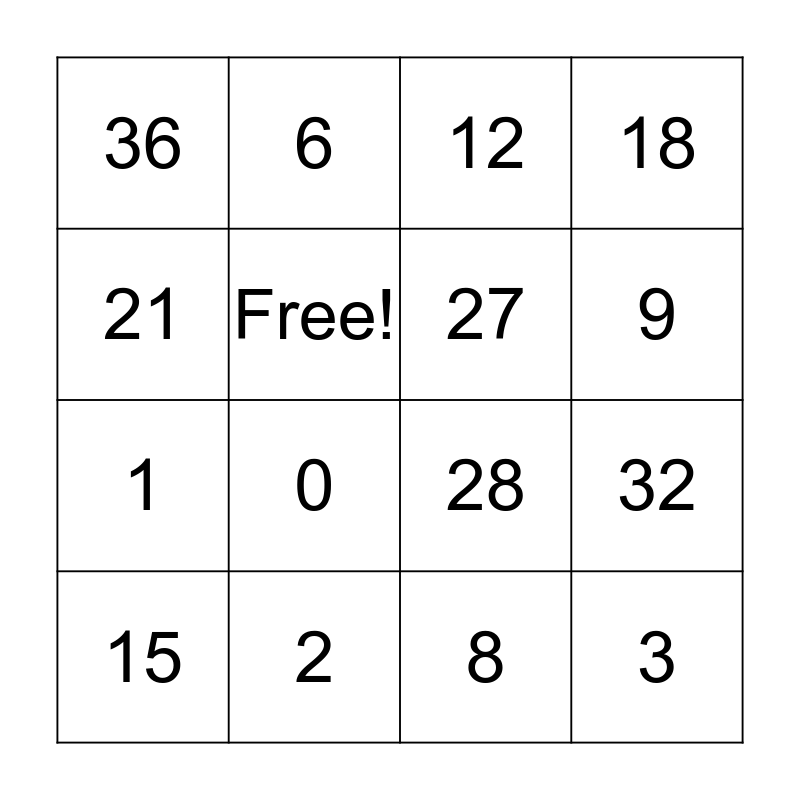 This bingo card has 16 words: 2, 32, 12, 36, 1, 6, 28, 8, 21, Free!, 15, 18, 0, 9, 27 and 3.