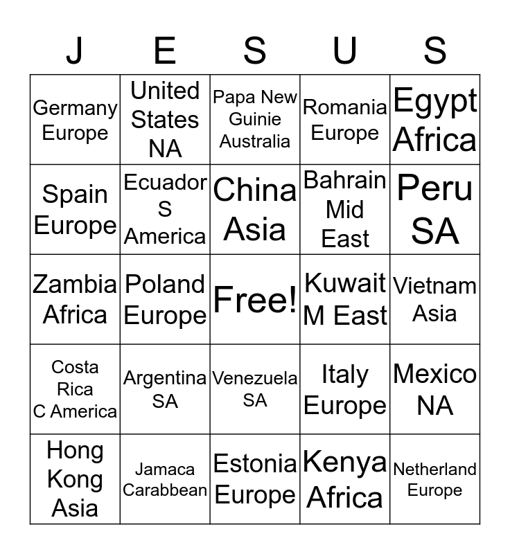This bingo card has a free space and 42 words: France SA, China Asia, Philippines Asia, Argentina SA, Kenya Africa, Mexico NA, Netherland Europe, North Korea Asia, Papa New Guinie Australia, Venezuela SA, Vietnam Asia, Peru SA, Poland Europe, Egypt Africa, Cuba NA, Italy Europe, Switzerland Europe, Zambia Africa, Haiti NA, United States NA, Spain Europe, Sudan Africa, Ireland Europe, Germany Europe, Angola Africa, Aruba Caribbean, Bahrain Mid East, Bolivia SA, Brazil SA, Cambodia Asia, Christmas Island Asia, Costa Rica C America, Ecuador S America, Estonia Europe, Ghana Africa, Hong Kong Asia, Jamaca Carabbean, Kuwait M East, Morocco Africa, Puerto Rico Caribbean, Romania Europe and Turkey W Asia.