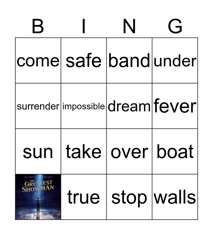 This bingo card has 1 images and 16 words: Free!, safe, band, boat, surrender, take, dream, fever, sun, true, over, under, come, impossible, stop and walls.