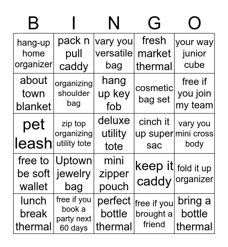 This bingo card has a free space and 24 words: Uptown jewelry bag, free if you book a party next 60 days, hang up key fob, lunch break thermal, your way junior cube, hang-up home organizer, about town blanket, pack n pull caddy, cinch it up super sac, mini zipper pouch, cosmetic bag set, pet leash, keep it caddy, fold it up organizer, organizing shoulder bag, free if you brought a friend, vary you mini cross body, vary you versatile bag, free if you join my team, zip top organizing utility tote, bring a bottle thermal, free to be soft wallet, fresh market thermal and perfect bottle thermal.