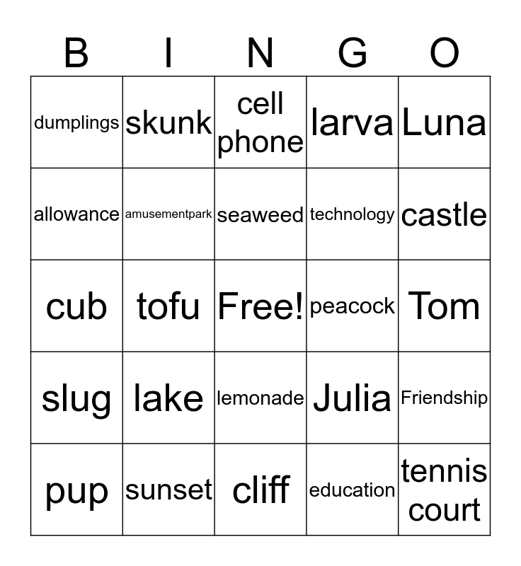 This bingo card has a free space and 28 words: Friendship, money, technology, education, allowance, cell phone, skunk, slug, peacock, pup, cub, larva, sunset, cliff, castle, meusli, lake, amusementpark, seaweed, lemonade, dumplings, peas, tennis court, tofu, Tom, Julia, Luna and Phillip.