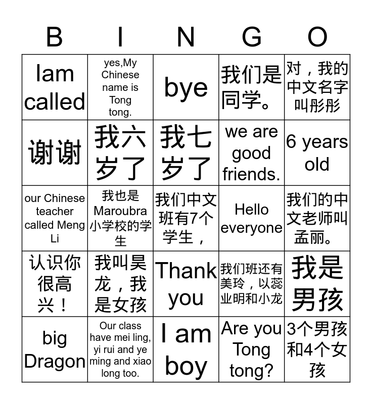 This bingo card has a free space and 37 words: 大家好, 我叫, 大龙, 我六岁了, 我是男孩, 我叫昊龙,我是女孩, 我七岁了, 你是彤彤吗?, 对,我的中文名字叫彤彤, 我是ML中文学校的学生, 我也是Maroubra小学校的学生, 我们是同学。, 3个男孩和4个女孩, 我们的中文老师叫孟丽。, 谢谢, 认识你很高兴!, 再见, bye, Thank you, Hello everyone, Iam called, 6 years old, big Dragon, I am boy, Iam Hao Long, I am girl, Are you Tong tong?, yes,My Chinese name is Tong tong., Iam ML Chinese School student., I am Maroubra bay School student too., we are classmate, our Chinese class have 7students, 3boys and 4 girls, Our class have mei ling, yi rui and ye ming and xiao long too., our Chinese teacher called Meng Li, Nice to meet you., 我们班还有美玲,以蕊业明和小龙, we are good friends. and 我们都是好朋友.