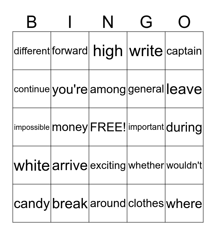 This bingo card has a free space and 24 words: arrive, break, among, candy, captain, different, continue, forward, important, exciting, general, impossible, whether, wouldn't, you're, clothes, during, high, leave, money, where, white, write and around.