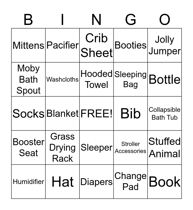 This bingo card has a free space and 24 words: Grass Drying Rack, Hat, Hooded Towel, Humidifier, Jolly Jumper, Mittens, Moby Bath Spout, Pacifier, Bib, Sleeper, Sleeping Bag, Socks, Stroller Accessories, Stuffed Animal, Washcloths, Change Pad, Collapsible Bath Tub, Crib Sheet, Bottle, Blanket, Book, Booster Seat, Booties and Diapers.