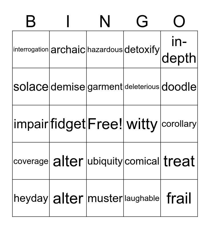 This bingo card has a free space and 34 words: outbreak, decipher, bequeath, detrimental, corollary, solace, demise, muster, deleterious, frail, impair, archaic, laughable, lofty, coverage, fidget, ubiquity, witty, treat, heyday, alter, frayed, detoxify, doodle, perilous, alter, hazardous, scope, in-depth, interrogation, disarmament, garment, comical and melancholy.