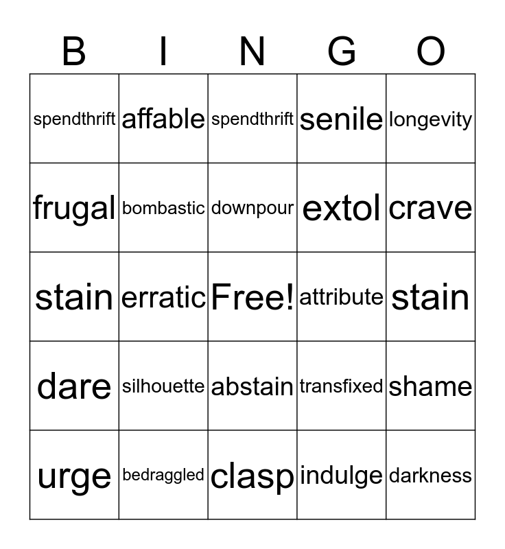 This bingo card has a free space and 24 words: silhouette, bedraggled, downpour, urge, longevity, spendthrift, frugal, affable, attribute, abstain, extol, stain, transfixed, shame, bombastic, indulge, stain, spendthrift, crave, erratic, darkness, dare, senile and clasp.